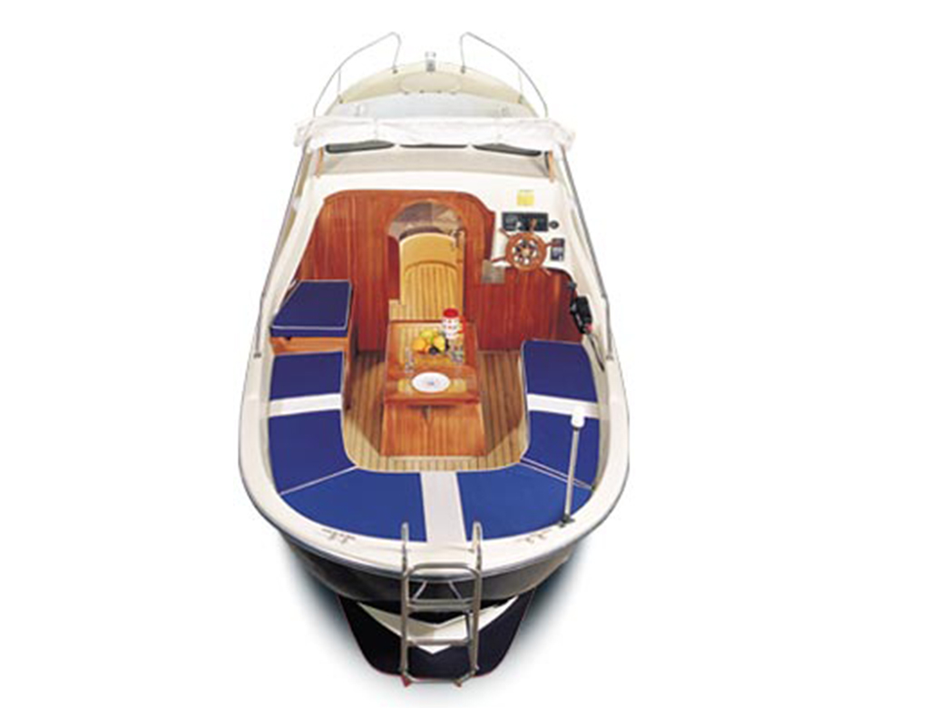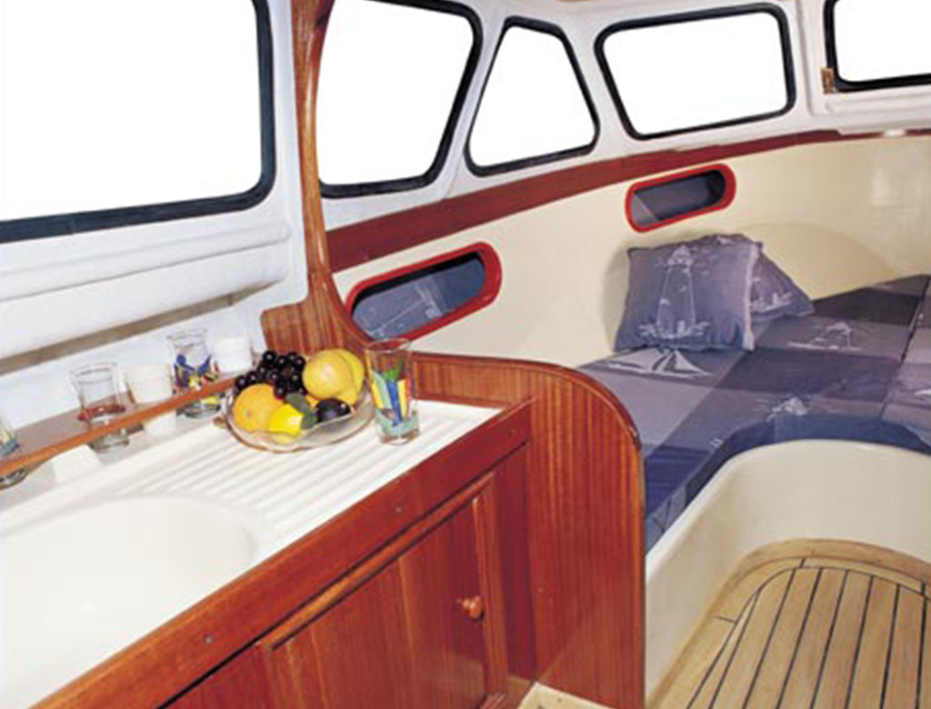 Stainless steel shaft, lubricating nipple, gasket, brass propeller, chrome-nickel rudder range, plexiglass chamber windows, securit hood windows, opening window giving access to deck from cabin other lockers with hinged lid, mahogany veneered bulkheads, cabin door with lock, double bed space, exit hatch cover to the deck 3 hinged compartments suitable for storing materials, chain holder and hinged cover, chrome-nickel front railing, chrome-nickel ladder, wooden motor case, wooden headlights, portable WC, kitchen cabinet and sink, faucet-booster-water tank and connection, bilge pump and its connection, pier-starboard light, cabin lamp, electrical installation, switches and fuses, engine assembly, valve in engine connection, exhaust system outlet, water lock, goose neck, hoses / clamps / connection, steering wheel / system and cable , remote control system and cable, fore chain roller, cleats, stainless steel U shaped towing hook, inner and outer cushions, 25 liter fuel tank, flag pole, battery, battery circuit breaker.